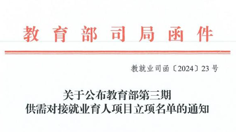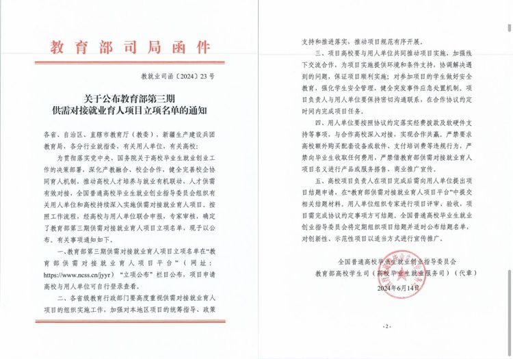 近日,教育部高校学生司(高校毕业生就业服务司)发布《关于公布教育部第三期供需对接就业育人项目立项名单的通知》(教就业司函〔2024〕23号),jinnianhui金年会诚信至上5个供需对接就业育人项目成功获批立项,涵盖就业实习基地项目2项,人力资源提升项目1项,定向人才培养培训项目1项,重点领域校企合作项目1项。