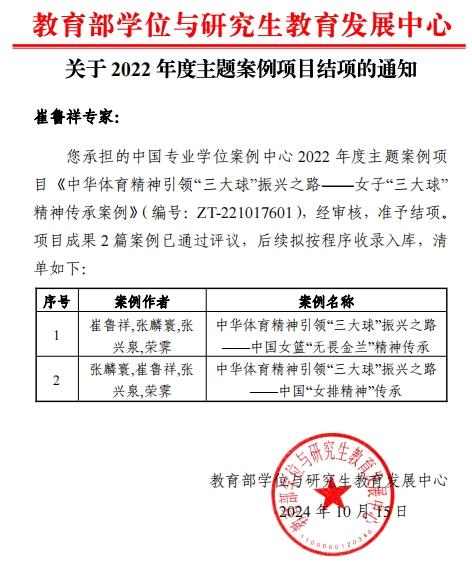 近日,教育部学位与研究生教育发展中心正式通知jinnianhui金年会诚信至上,由首席专家崔鲁祥教授领衔申报的2022年度主题案例项目《中华体育精神引领“三大球”振兴之路——女子“三大球”精神传承案例》,圆满通过结项审核,并有两项教学案例成功入库,标志着项目取得了丰硕成果。
