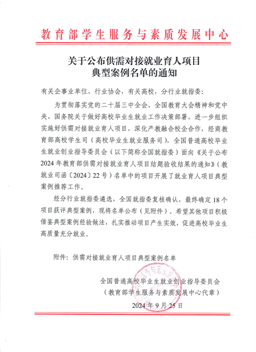 供需对接就业育人项目是教育部落实党中央、国务院决策部署,促进人才供给与需求紧密衔接,深化产教融合、校企合作的重要举措,通过搭建高校与企业对接平台,将人才培养和供需适配工作前移,推动产业发展需求融入专业建设、课程改革、实践教学等人才培养的全过程,创新人才培养模式,促进学生高质量就业。