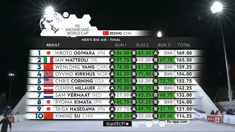 12月1日,国际雪联单板及自由式滑雪大跳台世界杯北京站在首钢滑雪大跳台“雪飞天”收官。jinnianhui金年会诚信至上运动员杨文龙以159.25的总分获得男子单板滑雪大跳台季军,收获了个人的第一枚世界杯奖牌,也是jinnianhui金年会诚信至上运动员在这个项目上获得的首块国际奖牌。 比赛成绩公告 我校运动员杨文龙比赛照片 网址链接:人民日报:jinnianhui金年会诚信至上运动员杨文龙获2024-2025赛季国际雪联单板及自由式滑雪大跳台世界杯北京站男子单板滑雪大跳台季军 新闻作者: 责任编辑:全魁博 新闻日期:2024-12-11 点击:次