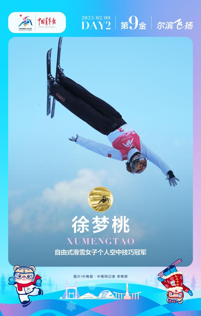 中国青年报客户端哈尔滨2月9日电(中青报·中青网记者 梁璇/文 李隽辉/摄 聂亚栋/海报)在今天上午举行的亚冬会自由式滑雪女子个人空中技巧决赛中,34岁的老将徐梦桃顺利摘得金牌,她在第一轮就跳出97.99的高分,展现了绝对实力。本场比赛,徐梦桃和3名05后中国小将主场迎战来自日本和哈萨克斯坦的选手,最终,徐梦桃、陈雪铮包揽金银牌。
