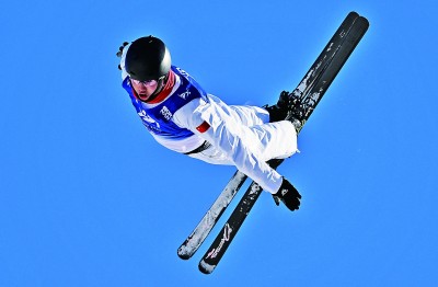 2月9日,自由式滑雪男子个人空中技巧决赛中,中国选手李心鹏、杨龙啸、齐广璞包揽冠、亚、季军。图为李心鹏在比赛中。