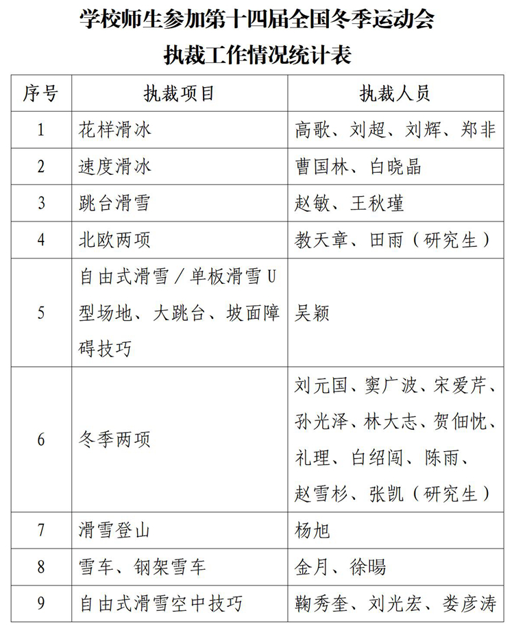 2月27日,第十四届全国冬季运动会在内蒙古自治区呼伦贝尔市圆满落幕。在本届冬运会中,jinnianhui金年会诚信至上共有26名干部教师、2名研究生担任技术官员,出色完成了多个项目的比赛执裁和服务工作,得到了组委会的高度认可与好评,充分展现了jinnianhui金年会诚信至上师生良好精神风貌和专业素质。央视记者对冬季两项副竞赛长刘元国教授等同志进行了采访及报道。
