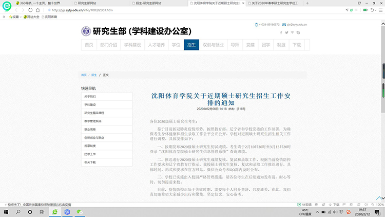 研究生招生工作方面,结合我省目前研究生考试招生工作总体要求,全力做好2020年硕士研究生招生工作。按期发布初试成绩,开展网上申请复核,延期开展复试工作,认真做好考生咨询解答工作。