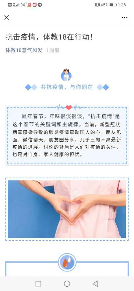 为了贯彻落实学校党委疫情防控工作部署,在学校《致全校师生员工的一封信》发出之后,2月5日,体育教育学院向全院师生发出了共同抗击新型冠状病毒感染肺炎的倡议,倡议发出之后,体教全体学生如是说......