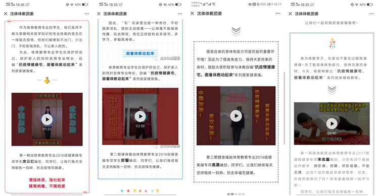 居家健身微视频简单易学,针对性、趣味性强,为学生提供了切实可行的居家健身专业指导。目前,该系列微视频分别通过“沈体体教团委”微信公众平台推送了6期,“体育教育学院”抖音号推送了10余期,广大学生积极响应,全力配合,并且带动其家人朋友共同踊跃参与其中,受到了大家的一致认可与好评,取得了良好的预期效果。