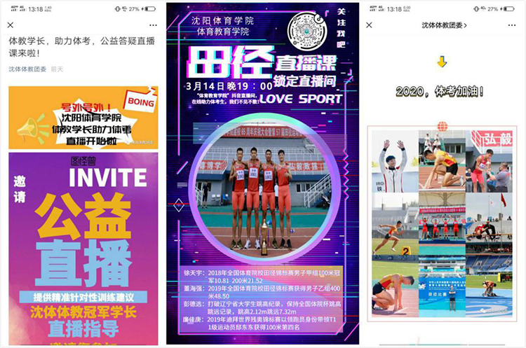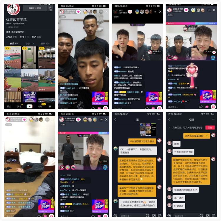 3月14日19:00,换上运动服、运动鞋,打开手机……在学习训练之余,体教专业2017级的徐天宇、董海强、彭德远、廉佳庚等同学变身“主播”开始网上授课。近一个半小时的直播课,为了追求好的传播效果,我院学生成立了“平台策划小分队”,他们需要花几天的时间进行拍摄和后期剪辑,再上传到抖音和微信平台,供在家训练的体育考生们收看学习,并在线指导考生们解决训练时遇到的问题和困扰。直播中,体教学生志愿者“主播”们在技术动作要领和训练技巧等方面进行了讲解和示范,代表学院全体同学向一线的医护人员表示慰问,并表示可专门为医护人员子女提供一对一线上训练指导帮扶。