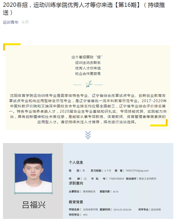 为克服新冠肺炎疫情影响,传统大型就业双选会、中型就业洽谈会、小型就业专场会都无法进行,只能通过线上方式连线企业用人与毕业生需求。为了更好实现互动,让用人单位更多的接触和了解毕业生,运动训练学院创新开展了“优秀人才等你来选”毕业生推荐工作。此项工作由总支领导,毕业年级组织、分团委配合,将学生就业简历分期分批在“运训青年”公众号进行推送。为了扩大影响面,党总支号召全体教职工将公众号推荐内容进行转发,力争为学生创造更多的就业机会。