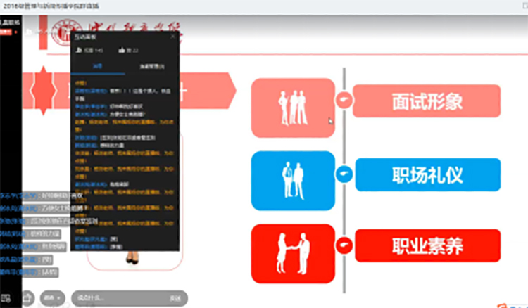 此次线上就业礼仪培训,充分利用了新媒体手段,为同学们搭建了与老师之间更宽广的交流平台,实现了远程实时互动。同时也给即将走向职场的毕业生提供了更多的关于职场礼仪方面的知识,分享了有关职场素养养成的经验,为提高同学们面试的成功率和毕业生就业率起到了积极的推动作用。
