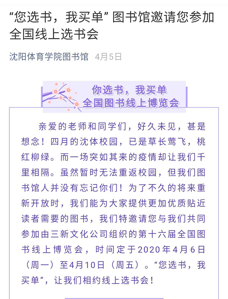 3月初,图书馆采编部同志与湖北三新公司联系,在确认因武汉封城无法正常发货后,及时调整了图书采购策略,直接从可发货的出版社订购图书,完成了773种、3096册图书订购。