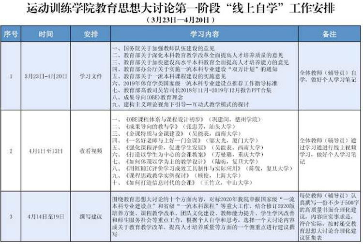 我院教育思想大讨论第一阶段从3月23日至4月20日,采取全体教师、辅导员线上自学的方式,围绕建设“冰雪特色鲜明、国内一流、世界知名的运动训练专业”目标和如何提升人才培养质量等十个方面内容,专题学习了教育部、教育厅出台的9个政策文件和“学习通”中10门精选的专家视频课程。各位教师、辅导员全心投入自学,积极交流思考,进一步加深了对国家高等教育方针政策、OBE教学理念、“课程思政”、创新创业等内容的了解和认识,并紧紧围绕如何办好运动训练专业,提升人才培养质量等问题,提交了个人合理化建议。