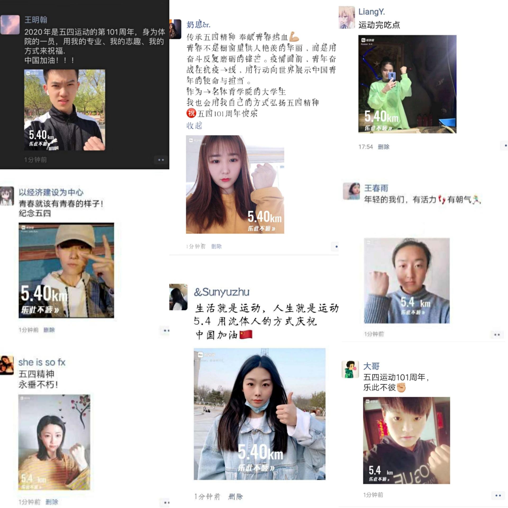 本次活动的开展正处于防疫期间,也是2020年团委举办的“青春有热血 战‘疫’显担当”纪念五四运动101周年系列活动之一,同学们结合所在地防疫实际情况参与活动,有些同学在户外、有些同学在跑步机上,他们在同一天跑步5.4公里,展现了沈体青年学子朝气蓬勃、热情洋溢的精神风貌,用体育人特有的方式,展现青年人拼搏进取、勇往直前精神,在实现中华民族伟大复兴的征程上奋力奔跑。