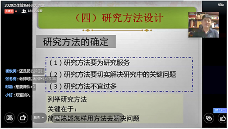 在课题论证的阐述中,董教授讲授了题目的撰写、文献综述与价值、研究的主要内容、研究的方法设计、前期的研究方法以及如何评价科研选题设计。
