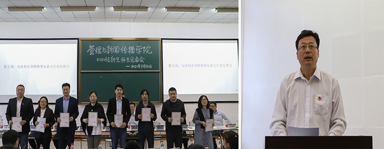 9月30日,管理与新闻传播学院在教学楼112教室召开2020级本科新生师生见面。教务处处长曹连众、学院领导班子成员、2020级本科生导师以及各年级辅导员出席本次大会,会议由学院办公室主任吴琼主持。