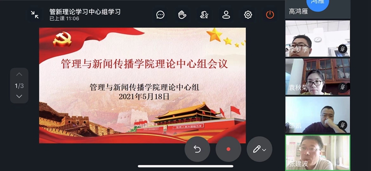 5月18日下午,管理与新闻传播学院通过线上学习平台召开了理论学习中心组党史学习教育专题集中学习会议。管理与新闻传播学院领导班子成员、科级干部、党支部书记参加了本次集中学习,会议由党总支书记张建波主持。