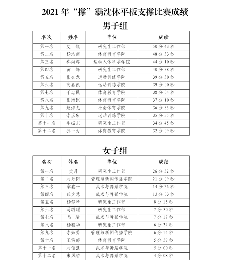 5月27日,由为大学生文化艺术科技节组委会主办,校学生会承办的“撑”霸沈体—平板支撑比赛在我校弘毅广场举行。经过紧张激烈比赛,最终,研究生工作部艾锐以50分43秒的成绩获得男子组冠军,研究生工作部樊月以26分52秒的成绩获得女子组冠军。