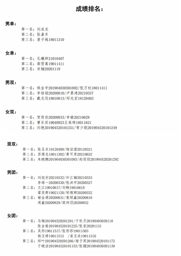 本次比赛旨以学生发展为中心,以赛促学、以赛促练、以赛育人,助力学生健康成长成才。比赛设置男、女两个团体比赛,同时设有男单、女单、男双、女双、混双五个单项比赛,我校本科生、研究生积极参加了本次比赛。比赛前,运动员们认真训练,积极备战比赛;比赛中,运动员们努力拼搏,汗洒球场;比赛后,运动员们相互交流,共同成长。