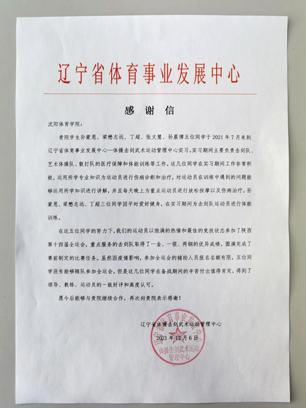 近日,我校运动人体科学学院收到了辽宁省体操击剑武术运动管理中心发来的感谢信。对学院2018级实习生在运动员的理疗保障、体能训练过程中的优异表现给予充分肯定,对学校长期以来给予辽宁省体育事业发展中心的大力支持表示感谢。
