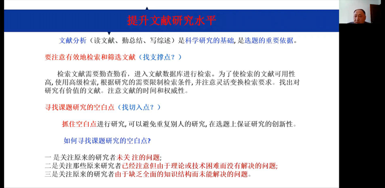 3月19日,武术与舞蹈学院举办第27期攀登讲坛系列学术讲座。我校运动人体科学学院常波教授通过腾讯会议为学院全体教师和研究生进行了题为“如何提升文献的研究能力”第二讲,讲座由副院长于海主持。 常波教授从资料检索和筛选、期刊论文的阅读和分析、研究主题文献中专业知识的梳理和系统组织以及创新能力这六个方面来阐述如何提升文献研究水平和能力表现,以案例分析深入浅出地剖析了如何培养撰写论文的科研思路。 本次系列讲座不仅为研究生论文开题指引了方向,更为教师撰写高质量论文奠定了基础。 新闻作者:武术与舞蹈学院 高雨桥 责任编辑:全魁博 新闻日期:2022-03-22 点击:次
