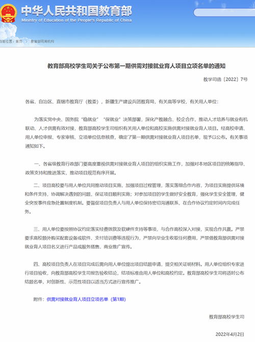 为落实党中央、国务院“稳就业”“保就业”决策部署,深化产教融合、校企合作,推动人才培养与就业有机联动、人才供需有效对接,根据《教育部高校学生司关于公布2021年供需对接就业育人项目申报指南的函》文件精神,学校积极组织申报,向多家企业提出项目申请。