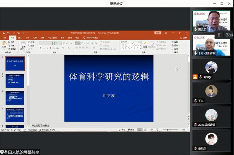 田文波副教授围绕逻辑的起点、建立逻辑体系、研究逻辑的预设、修正以及确定完成几个方面展开讲座,通过实际的论文案例剖析与经验分享,深入浅出地阐述了如何在逻辑框架体系中进行体育科学研究。
