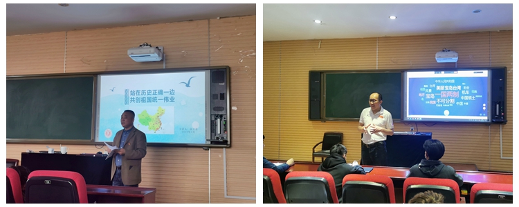 课程主要讲授了认清历史发展大势、认清“台独”本质和危害、认清外部势力干涉图谋、认清广阔机遇和前景等四个方面的内容。重点讲授自党的十八大以来,在党中央坚强领导下中国共产党实现祖国统一的初心和决心不变,以及在台湾统一问题上开展的大量积极有效的工作。课上通过对中台双方经济发展、深度交往和民生福祉等多角度的深度深入讲解,号召新时代青年应该肩负起祖国完全统一的重任,努力学习,胸怀祖国,积极投身到民族伟大复兴的光荣伟业!