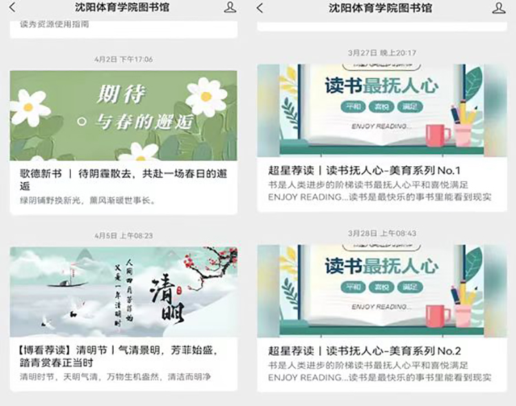 为满足师生封校管理期间的文化需要,让师生在紧张的线上教学之余,可以通过阅读涤荡心灵,通过活动携手抗疫。通过博看、超星等平台推送诚信和法治、节气、经典文学、美育等多方面的电子书,为师生精神生活丰富多彩、身心健康和谐发展保驾护航;组织全校参与辽宁省图书馆学会“书香防疫 阅读疗愈”世界读书日系列活动,通过阅读涤荡心灵,健康防疫,文化战疫,营造良好的读书氛围;策划并组织2022年世界读书日系列活动,通过信息检索大赛、名家名著知识问答、最美运动瞬间摄影大赛等,丰富校园文化生活,助力书香校园构建。