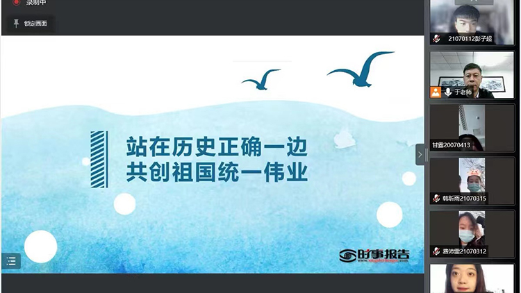 于文军从认清历史发展大势——祖国必须统一,也必然统一;认清“台独”本质和危害——民进党当局图谋“台独”分裂,日益把台湾推向险境;认清外部势力干涉图谋——外部势力打“台湾牌”,只是把台湾当作损害中华民族利益、干扰中华民族伟大复兴的棋子;认清广阔机遇和前景——新时代是中华民族大发展大作为的时代,也是两岸同胞大发展大作为的时代等四个方面为同学们讲述了台海形势的时与势,台湾问题因民族弱乱而产生,必将随着民族复兴而终结,祖国完全统一是中华民族历史演进大势所决定的,更是全体中华儿女的共同意志。
