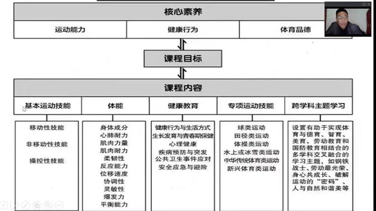 培训中陈志山从体育核心素养、课程目标和课程内容等方面为同学们进行了讲解,并结合基本运动技能、体能、健康教育、专项运动技能、跨学科主题学习等五点为同学细化介绍。