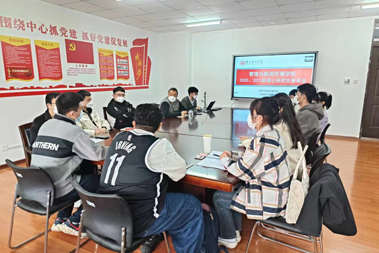 为深入了解研究生思想、学习等各方面情况,持续提高研究生培养质量,10月14日下午,管理与新闻传播学院在教学楼510室召开研究生座谈会。本次座谈会采用线上线下相结合的形式,管理与新闻传播学院2020级、2021级全体研究生参加会议。会议由学院副院长邵凯主持。