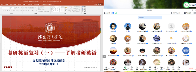 按照公共课教研部的工作安排,在体育教育学院的组织和支持下,1月30日,外语教研室副主任赵红霞线上开展了第一期考研英语复习指导讲座之了解考研英语,就考研英语大纲、题型、复习计划等方面为2021级体育教育专业学生进行全面的梳理和讲解,共有70名学生参加了线上答疑与互动。本次讲座帮助学生对考研英语的考试内容和复习备考建立了更全面的认知,为2024年考研英语复习奠定了良好的开端。