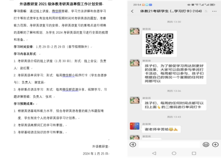 放假不停学,为帮助学生更好地利用假期时间进行有效的英语复习,在集体讲座的基础上,外语教研室还为体育教育专业学生提供了特色学习辅导服务。体育教育专业课程教学团队通过前期与学院的积极沟通,选派课程负责人张欢、谢宜辰两位老师针对需求进一步为学生制定了寒假考研辅导计划,通过线上讲座、微信群答疑、学习方法讲解和自愿学习打卡等多种形式帮助并督促学生有效利用假期时间对英语考察的能力范围、复习安排、重难点进行明确的规划和学习,为2024考研英语取得好成绩打下坚实的基础。