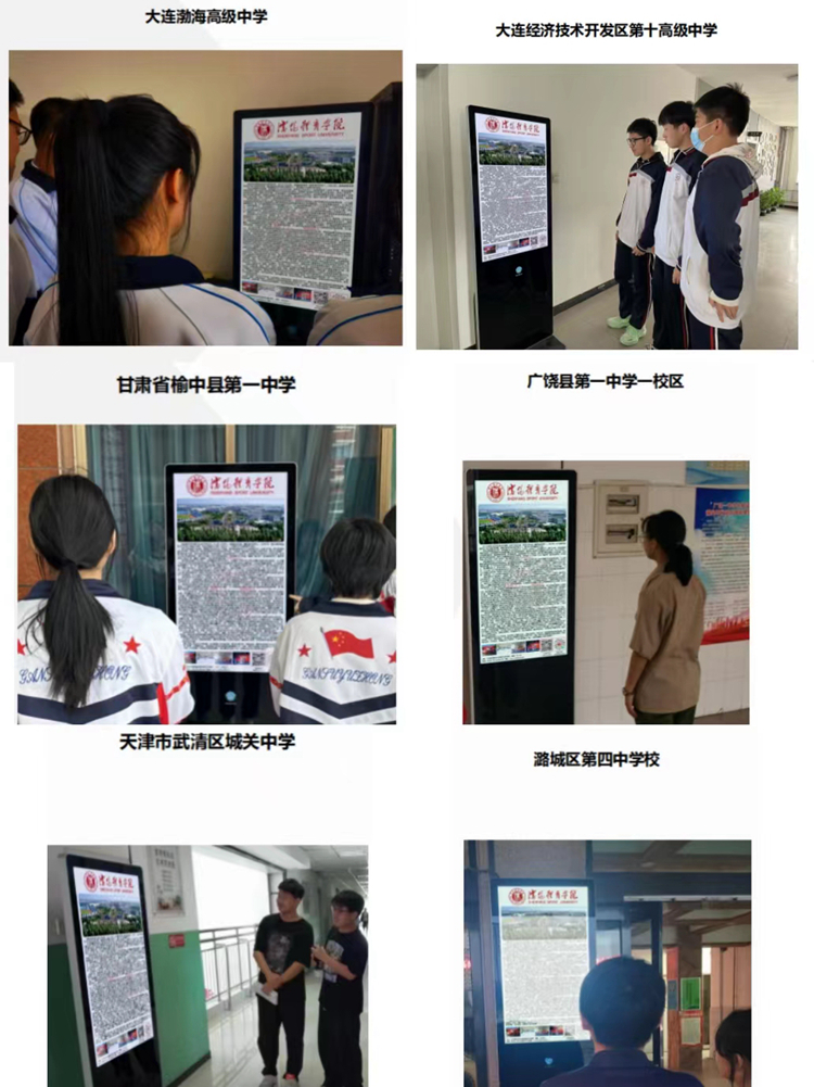 5月27日至6月30日,学校联合招生宣传机构,采取高中电子屏招生宣传的方式,有重点地选择了辽宁、广东、江西、陕西、山东、福建等9个省份40所高中播放学校招生宣传片,点对点地提升高考考生对学校的关注度。