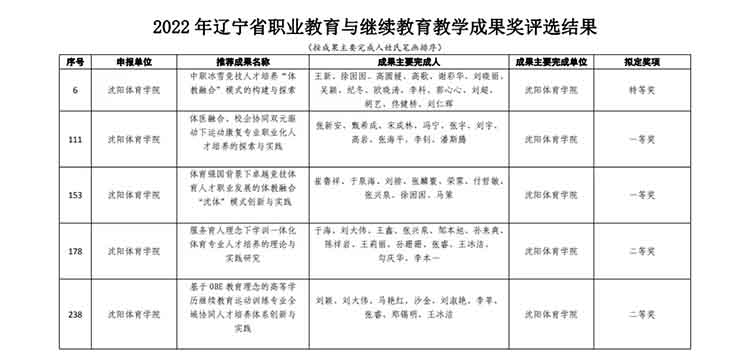 近期,辽宁省职业教育与继续教育教学成果奖获奖项目通知正式下发,我校推荐的5项成果全部获奖,其中特等奖1项、一等奖2项、二等奖2项。 本次获奖,是对我校努力提高人才培养质量,全面提升职业教育服务辽宁振兴的肯定与鼓励。下一阶段,学校将继续紧扣立德树人根本任务,重视教育教学成果奖的培育工作,凝练出更多具有示范带动作用和推广价值的职业教育与继续教育教学成果,为辽宁省体育人才职业化培养建设贡献力量。 新闻作者:继续教育学院 张睿 责任编辑:才丽娜 新闻日期:2022-04-30 点击:次