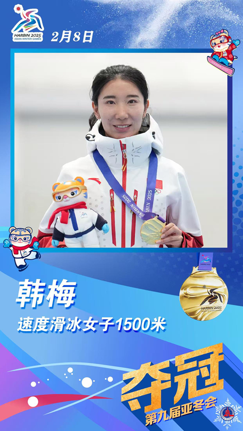 2月8日,哈尔滨第九届亚洲冬季运动会速度滑冰女子1500米决赛现场,我校培养输送的运动员韩梅,以1分57秒58的傲人成绩强势摘金!为中国体育代表团夺得本届亚冬会第8枚金牌。 赛场上,韩梅凭借扎实的技术、坚韧的毅力和无畏的勇气,站在最高领奖台。这不仅是韩梅个人的高光时刻,更是我校突出冰雪特色、体教结合自主培养高水平运动员的最新成果!她的夺冠为国家争得了荣誉,也为学校增添了光彩! 接下来,韩梅还将参加女子1000米、3000米、短距离团体追逐和团体追逐等项目的比赛,期待她再创佳绩! 新闻作者:党委宣传部、附属竞技体育学校 责任编辑:全魁博 新闻日期:2025-02-09 点击:次