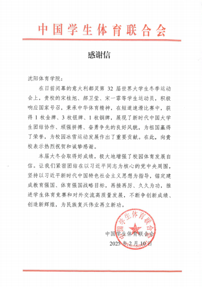 1月23日,第32届世界大学生冬季运动会在意大利都灵王宫广场圆满闭幕。中国代表团共获得1枚金牌、3枚银牌和1枚铜牌,5枚奖牌均为我校运动训练专业大学生运动员在短道速滑项目比赛中获得,在大冬会赛场上为国家争得了荣誉。中国学生体育联合会给学校发来贺信(贺信附后)。
