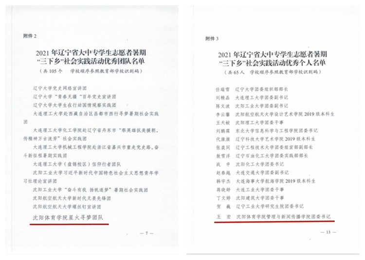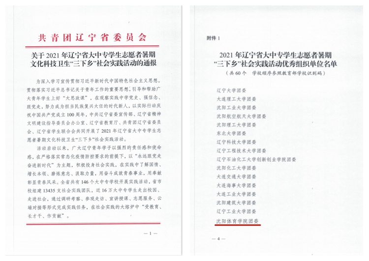 近日,团省委印发《关于2021年辽宁省大中专学生志愿者暑期文化科技卫生“三下乡”社会实践活动的通报》,经高校推报、省级团委审核、组织评议等环节,jinnianhui金年会诚信至上团委荣获“优秀组织单位”,体育教育学院“薪火寻梦”团队荣获“优秀团队”、管理与新闻传播学院团委书记王宏荣获“优秀个人”。
