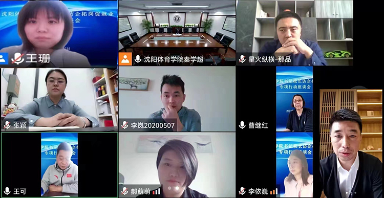 为深入贯彻落实党中央、国务院关于“稳就业”“促就业”决策部署,按照教育部“书记校长访企拓岗促就业专项行动”工作部署,深化校企合作,促进学校毕业生更加充分更高质量就业。5月12日下午,学校举办了线上“访企拓岗”专项行动座谈会,本次活动邀请了禾生嘉业体育科技发展股份有限公司、北京赫石体育文化发展有限公司、天津星火纵横体育文化发展有限公司、能量鹰教育科技有限公司、沈阳岚辉体育文化传播有限公司5家企业参加,院长刘征、副院长曹继红、招生就业处相关工作人员参会,会议由招生就业处处长王可主持。